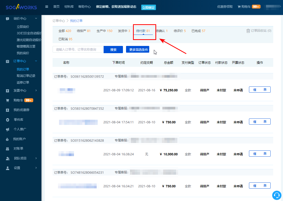 4. 點(diǎn)擊【待付款】,進(jìn)入代付款訂單列表